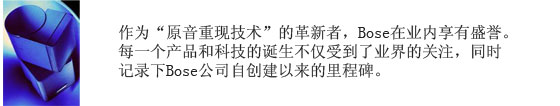 Bose公司由美国麻省理工学院电子工程教授Amar G. Bose博士创建于1964年,是世界上最早的扬声器生产商之一,也是业内“原音重现技术”的革新者。Bose总部位于美国麻省,Bose公司以”尽探索之力,享音乐之极”为经营理念。经过40多年不懈的研究与创新,Bose现已诞生400多种创新产品,共获得100多项科技发明专利,并在不同领域屡获殊荣。Bose的产品涵盖了高端家庭音响、高级汽车音响、大型场馆扩声系统、商业音乐系统、消噪耳机、通用扩声/现场演出系统,甚至涉及航空航天、生物医学等领域,几乎只要对高品质声音有需求的地方,都有Bose的身影。